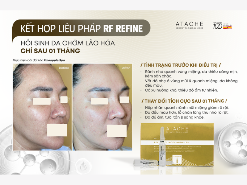 Để đạt hiệu quả tối ưu về cả chất lượng và thời gian, cơ sở đã ứng dụng Revive Collagen Ampoules để chuẩn bị trước, hỗ trợ trong và củng cố sau các liệu pháp RF Refine. Excellence Revive Collagen Ampoules - giải pháp cao cấp hội tụ khoa học công nghệ Peptide và các dưỡng chất sinh học, giúp tái trúc toàn diện nền da: tái thiết ma trận ngoại bào, gia cố màng đáy và thúc đẩy quá trình lành thương.