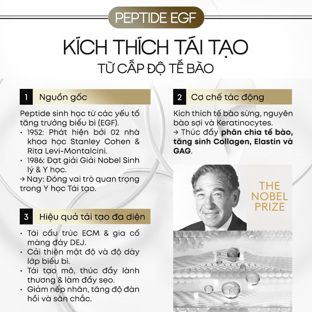 Peptide EGF (Epidermal Growth Factor - yếu tố tăng trưởng biểu bì) là “ngôi sao sáng” trong lĩnh vực tái tạo da. Peptide EGF là các peptide sinh có nguồn gốc từ các yếu tố tăng trưởng biểu bì, tạo nên tác động đa diện trong việc sửa chữa và phục hồi, tái cấu trúc nền da. Hoạt chất là trợ thủ đắc lực cho những liệu trình xâm lấn tại các cơ sở làm đẹp, để chuẩn bị da trước, hỗ trợ trong và củng cố kết quả sau các thủ thuật.