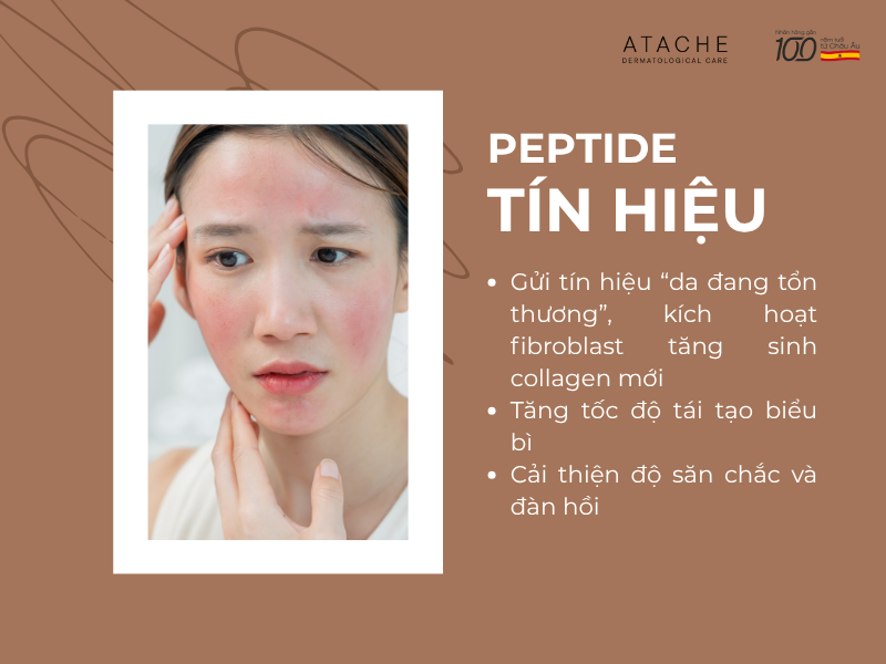 Peptide tín hiệu (Signal Peptide) là nhóm được nghiên cứu nhiều nhất trong trẻ hoá da. Chúng thường mô phỏng những đoạn peptide được giải phóng khi collagen bị phân hủy. Khi phát hiện sự xuất hiện của các đoạn này, fibroblast nhận “thông điệp” rằng cấu trúc trung bì đang suy yếu và cần tăng sản xuất collagen mới.