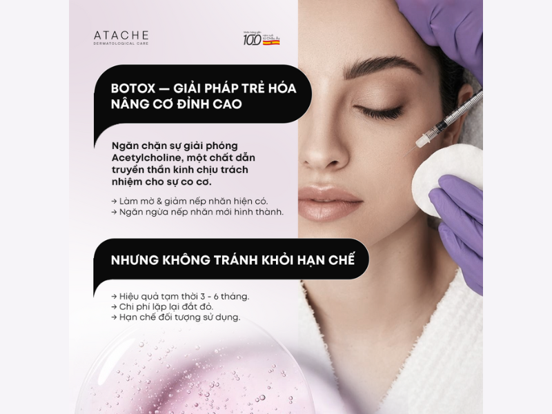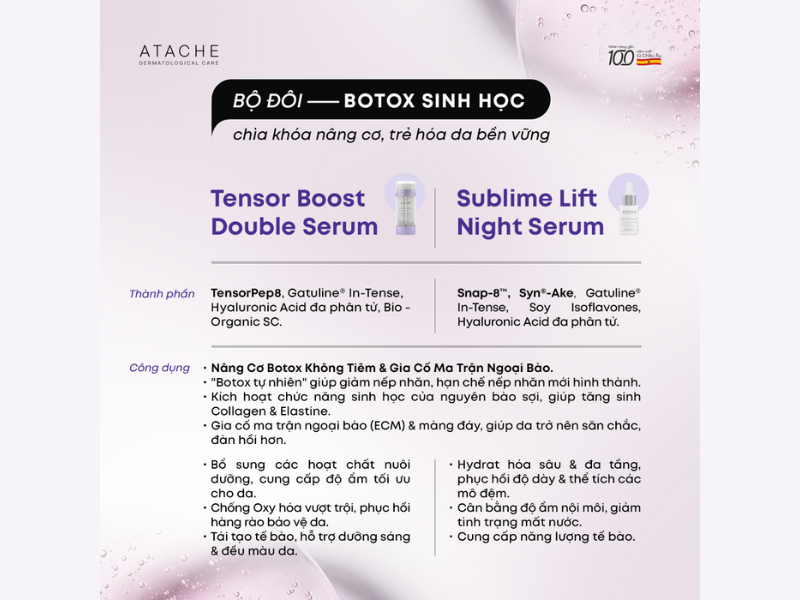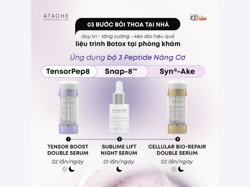 Với phác đồ bôi thoa hỗ trợ liệu trình tiêm Botox tại phòng khám, Atache ưu tiên ứng dụng 2 dòng sản phẩm Lift Therapy và Excellence, tạo thành cơ chế tác động kép thông minh vừa tạo hiệu ứng nâng cơ tức thì vừa đi sâu củng cố cấu trúc, giúp da săn chắc và đàn hồi: