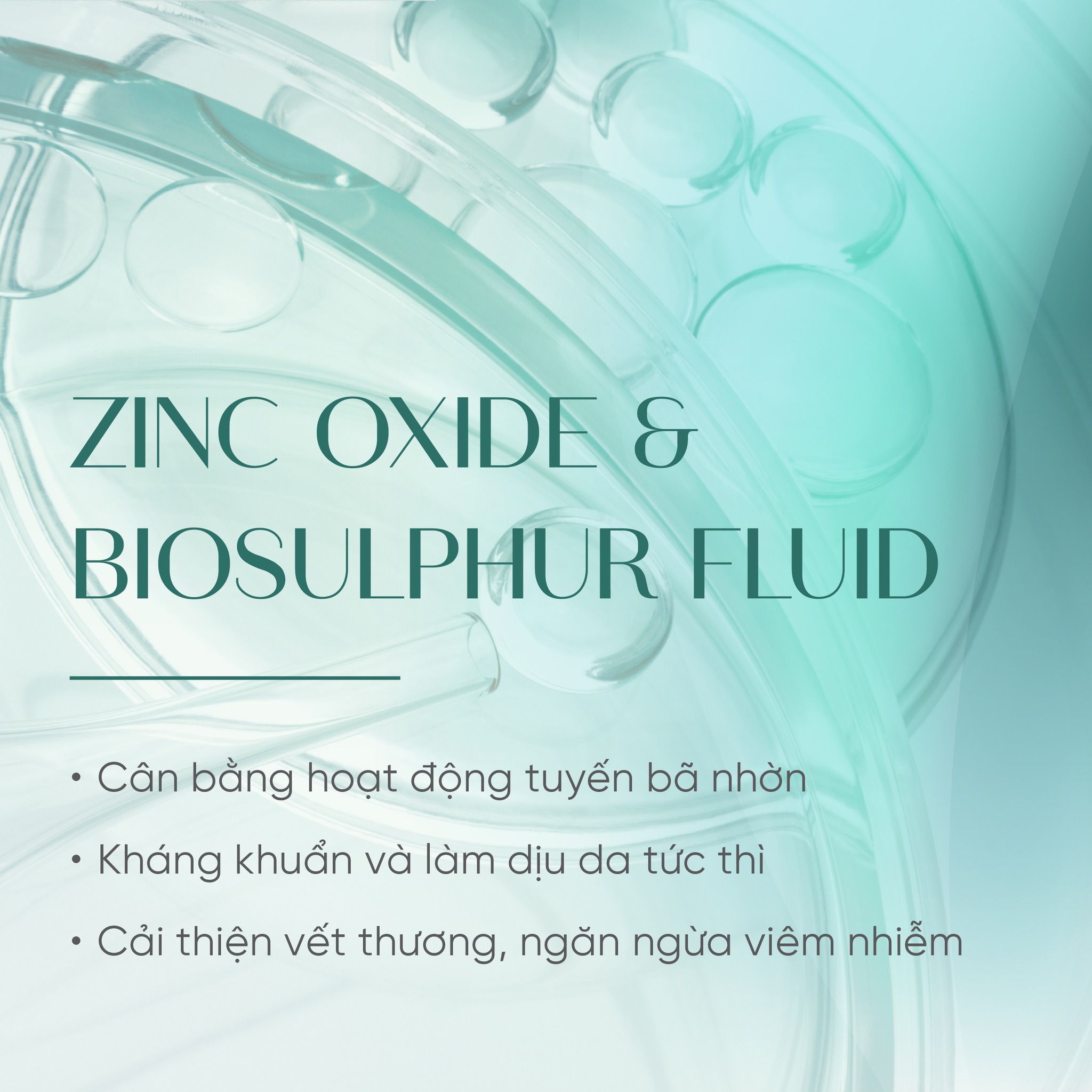 Biosulphor Fluid (Lưu huỳnh sinh học): Lưu huỳnh từ lâu đã được sử dụng trong các liệu pháp điều trị mụn nhờ khả năng làm sạch da hiệu quả. Lưu huỳnh sinh học có tác dụng loại bỏ các tạp chất, làm sạch lỗ chân lông và giảm tình trạng mụn sưng viêm. Nó còn giúp điều chỉnh sản xuất dầu, ngăn ngừa tình trạng tiết dầu quá mức, điều này cực kỳ quan trọng trong việc kiểm soát mụn. Không chỉ giúp da sạch sẽ, lưu huỳnh còn làm dịu và giảm kích ứng, giúp da hồi phục nhanh chóng.