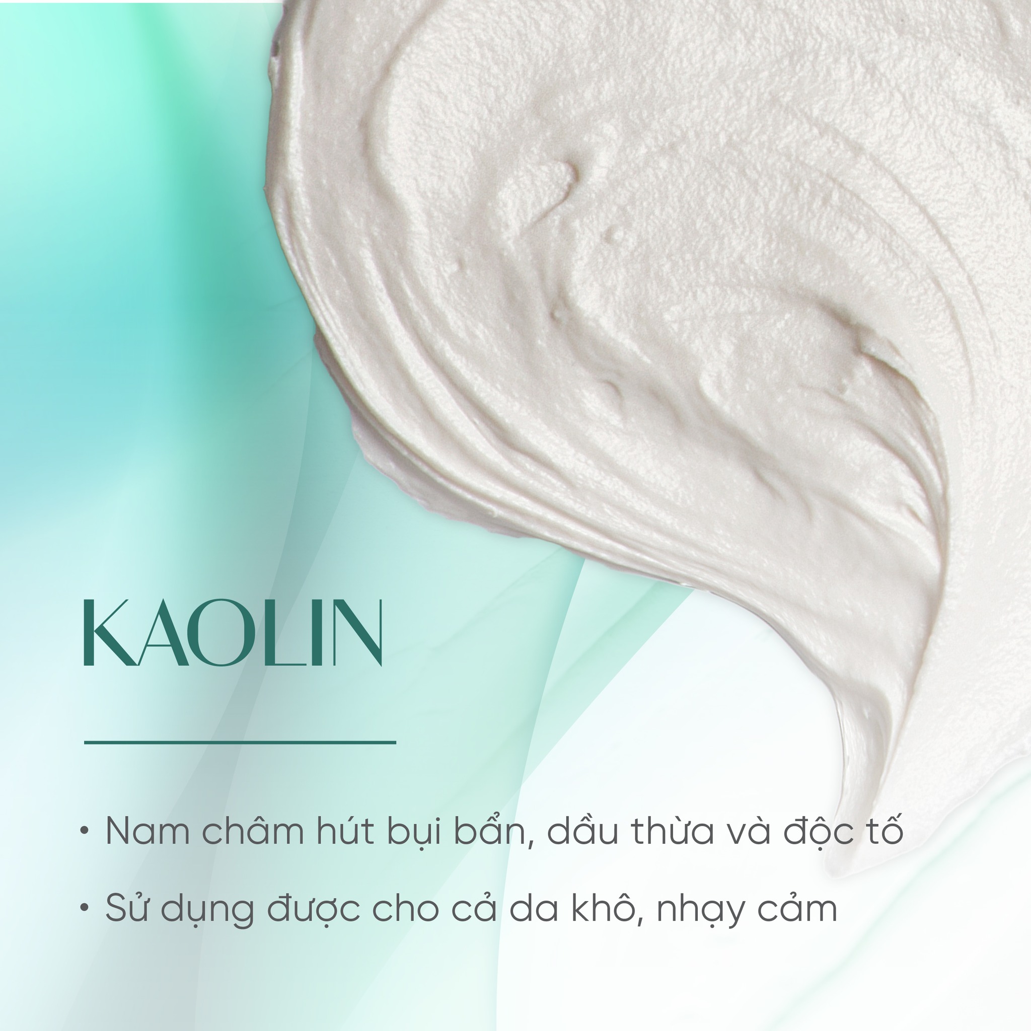 Kaolin (Đất sét trắng): Đây là một thành phần tự nhiên được biết đến với khả năng hấp thụ dầu thừa và độc tố trên da. Kaolin giúp làm sạch sâu lỗ chân lông, loại bỏ bụi bẩn và các tạp chất mà các sản phẩm làm sạch thông thường không thể loại bỏ. Bên cạnh đó, Kaolin còn giúp se khít lỗ chân lông, giữ da thông thoáng, không bị tắc nghẽn, từ đó hạn chế hình thành mụn. Đặc biệt, đất sét này có tác dụng làm dịu và tái tạo da, giúp da trở nên mịn màng và khỏe mạnh hơn.